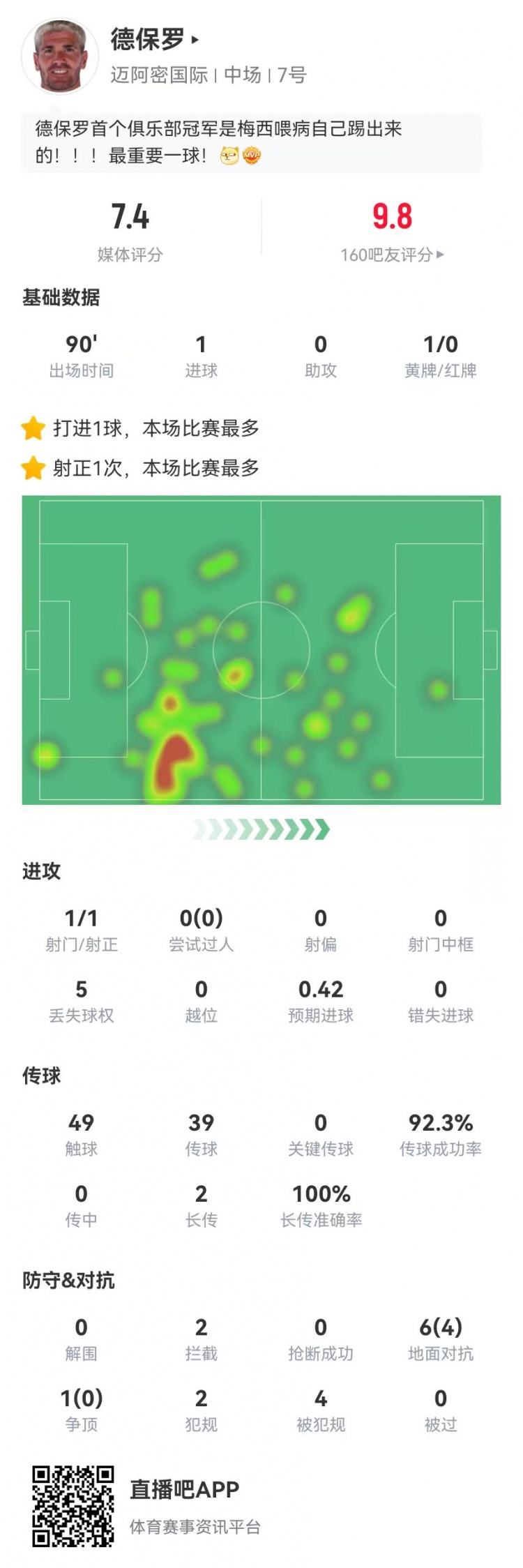 德保罗本场1球+2长传 2拦截2犯规2造犯规+7对抗4成功 获评7.4分