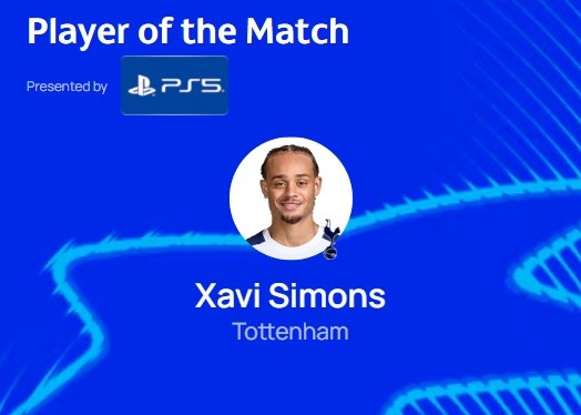 造点+点射!官方:哈维·西蒙斯当选热刺vs布拉格斯拉维亚MVP