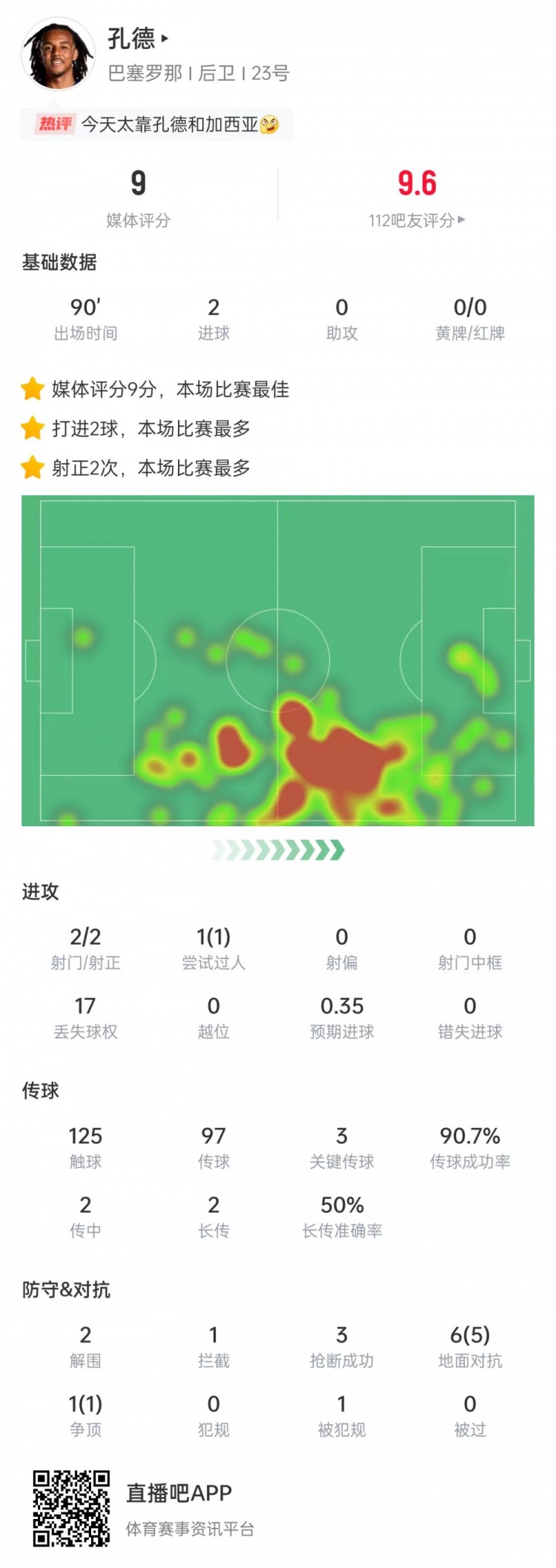 头球双响!孔德数据:2次射门进2球,3次关键传球,评分9全场最高