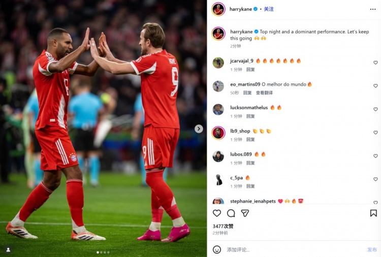 凯恩社媒晒照庆祝胜利:有统治力的欧冠之夜,让我们保持当前势头