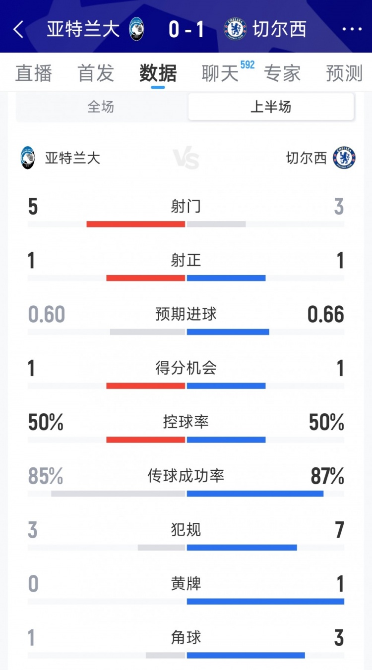 切尔西1-0亚特兰大半场数据:射门3-5,射正1-1,得分机会1-1
