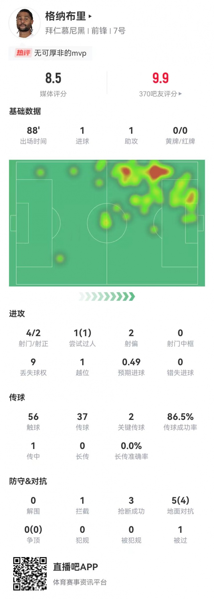 12月10日讯 拜仁在本轮欧冠对阵葡体,格纳布里本场数据如下: