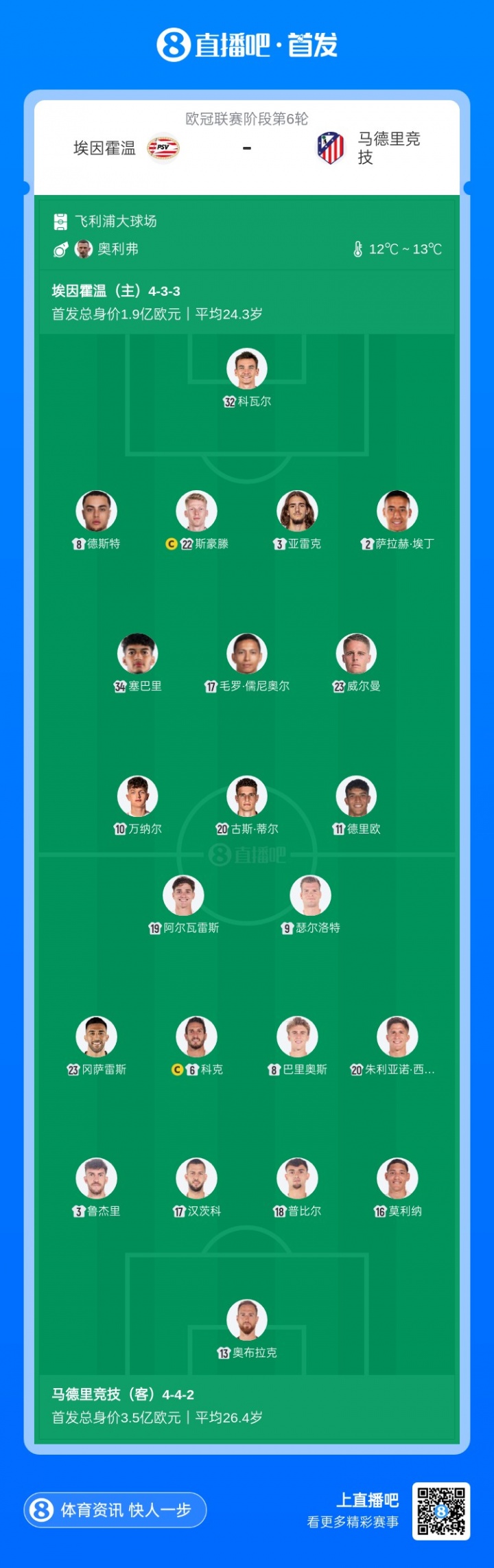 12月10日讯 北京时间12月10日4:00,欧冠联赛阶段第6轮,埃因霍温vs马竞。赛前双方公布了本场比赛的首发名单。