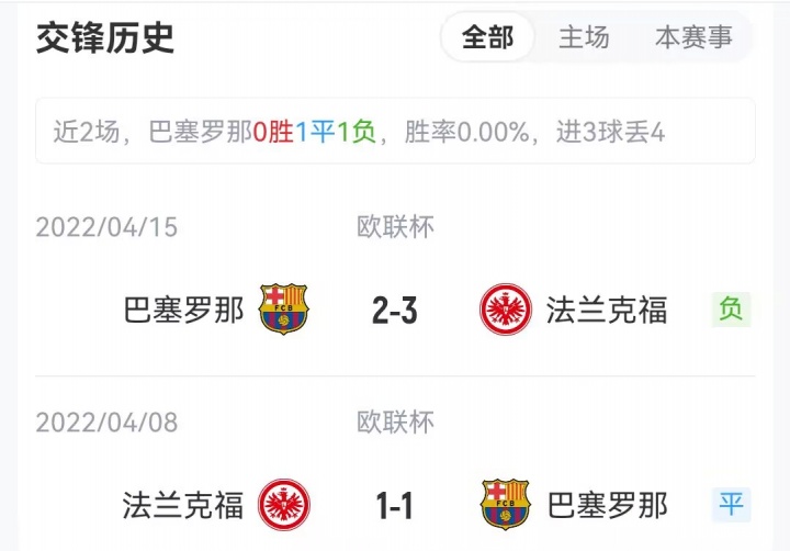 本场比赛前,巴萨2胜1平2负,积7分排名欧冠第18;法兰克福1胜1平3负,积4分排名排名欧冠第28。双方上次交手要追溯至22-23赛季的欧联杯淘汰赛,巴萨两回合总比分3-4遭法兰克福淘汰。