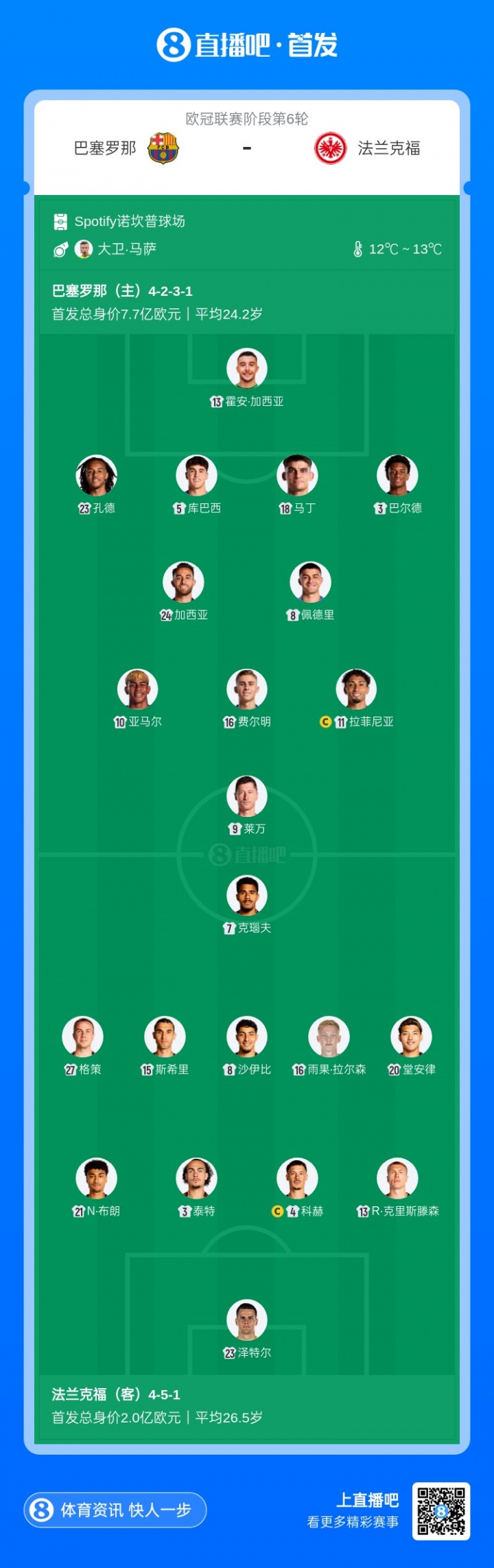 12月10日讯 北京时间12月10日4:00,欧冠联赛第6轮,巴萨vs法兰克福。赛前双方公布了本场比赛的首发名单。【巴萨方面,莱万、亚马尔、拉菲尼亚三叉戟联袂出战;法兰克福方面,格策、克瑙夫、堂安律登场。】